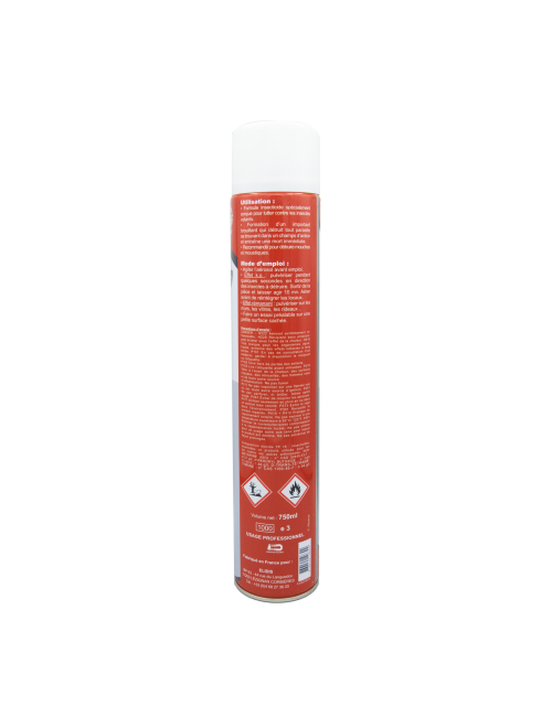 Produit actif : Solution insecticide à base de pyrethrinoïdes synergisées en phase solvant. Propulseur : Butane (Extrêmement infl ammable). Pourcentage matières actives pures :