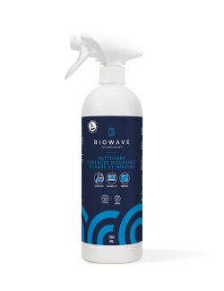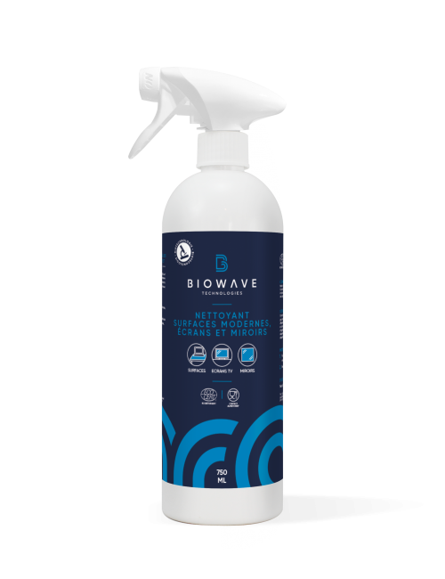 Biowave Nettoyant Surfaces Modernes, Écrans et Miroirs, nettoie efficacement vos surfaces sans laisser de trace. Il est parfaitement adapté pour vos surfaces modernes (surfaces laquées), écrans (TV, ordinateur, tablette), fenêtres, miroirs, plexiglas, inox, chromes… Il répond aux exigences des CHR, écoles, collectivité… Ce produit est écoformulé.